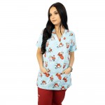 Bluza simpla destinata spitalelor, industriei alimentare sau farmaceutice, fiind ideala pentru utilizarea de catre medici si asistente in cabinete medicale, spitale, policlinici, etc. Aceasta bluza cu imprimeuri placute, in nuante calde, ofera un confort maxim si o rezistenta sporita. Este usor de intretinut, confectionata din materiale de calitate, cu croiala dreapta, cu maneca scurta, 2 buzunare inferioare aplicate frontal si slituri laterale. Lungimea este pana la nivelul soldurilor.