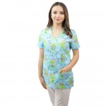 Bluza simpla destinata spitalelor, industriei alimentare sau farmaceutice, fiind ideala pentru utilizarea de catre medici si asistente in cabinete medicale, spitale, policlinici, etc. Aceasta bluza cu imprimeuri placute, in nuante calde, ofera un confort maxim si o rezistenta sporita. Este usor de intretinut, confectionata din materiale de calitate, cu croiala dreapta, cu maneca scurta, 2 buzunare inferioare aplicate frontal si slituri laterale. Lungimea este pana la nivelul soldurilor.