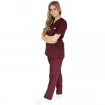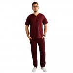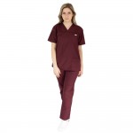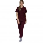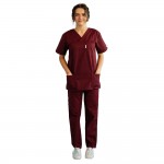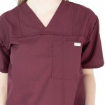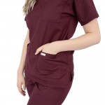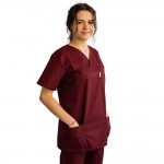 Bluza cu maneca scurta are un design simplu, cu guler in V, croi drept, cu doua buzunare la nivelul taliei si un buzunar la nivelul pieptului. In lungime ajunge pana la nivelul soldurilor. Realizata din material usor, comod, care nu se sifoneaza, rezistent la spalare.