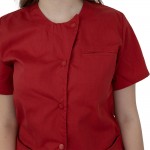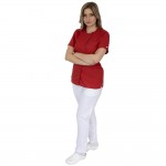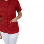 Bluza cu aspect elegant, confort maxim, rezistenta sporita, destinata industriei alimentare, farmaceutice sau spitalelor, ideal pentru utilizarea de catre medici, asistente, policlinici, etc. Bluza comoda si lejera, material usor, placut la atingere, nu se sifoneaza, isi pastreaza tinuta culorii, fiind rezistenta la spalare. Croiala dreapta, guler asimetric, inchidere cu capse, maneca scurta.